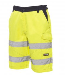 Bermuda homme, haute visibilité avec bandes réfléchissantes, élastiques latéraux et passants à la taille, fermeture éclair et bouton en plastique de fermeture, deux poches de coupe classique sur le devant, poche latérale LOCK SYSTEM, porte-mètre, deux poches arrière dont une ouverte et une à rabat et velcro, Coutures en contraste, entrejambe et intérieur jambes à triple aiguille.