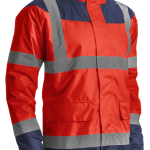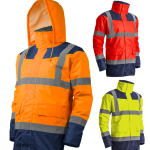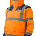 Parka Class 3 Polyester Oxford 300D fluorescent enduit PU Coutures étanchées EN 343 3.1. Matelassage Polyester avec zip accès sérigraphie, capuche 3 pans intégrée dans le col.
