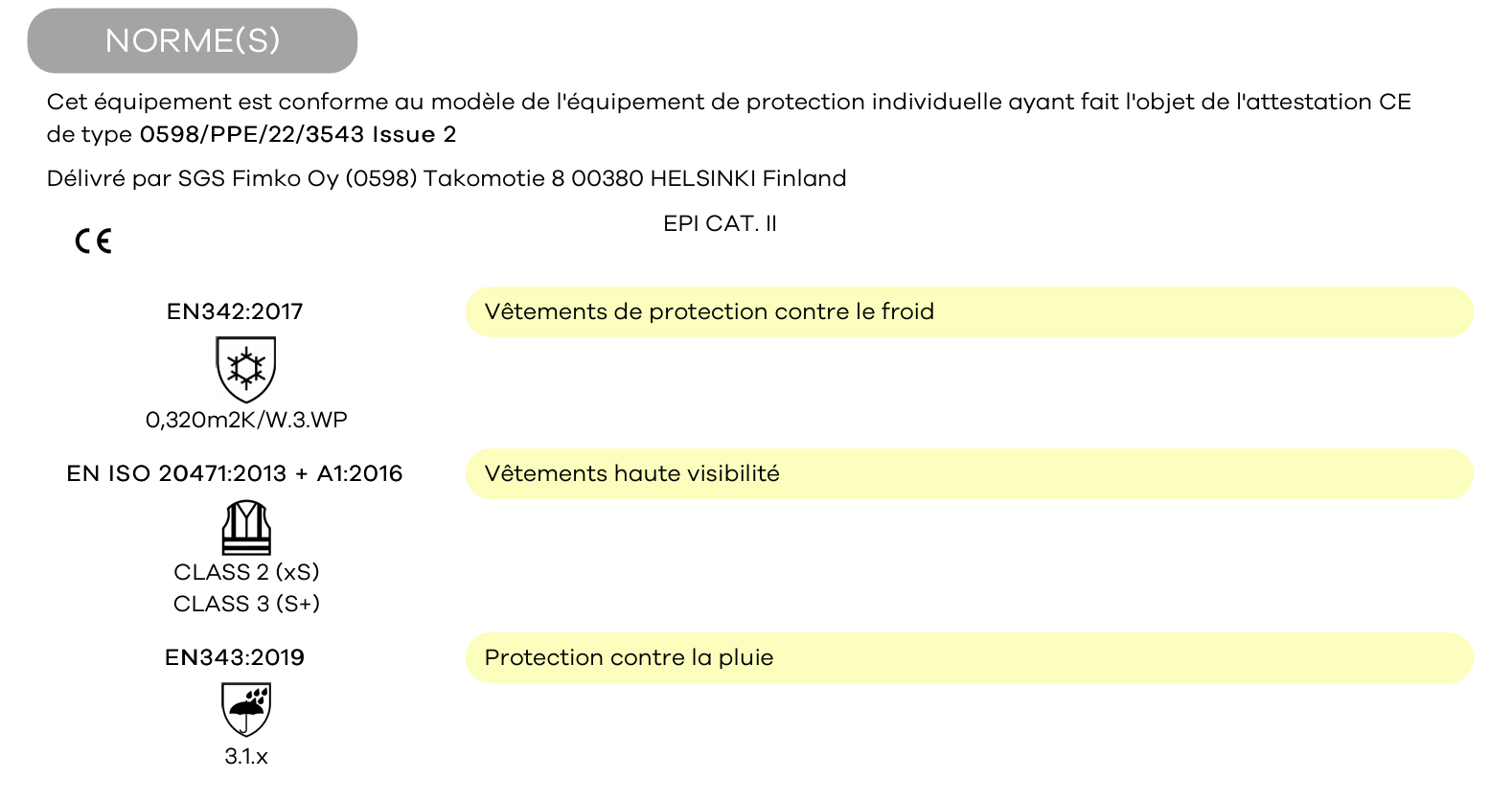 PROTECTION: thermique avec l’EN 342 et contre la pluie avec l’EN 343 FONCTIONNELLE: trappe zippée pour le marquage LARGE GRILLE DE TAILLE: XS au 5XL pour le jaune et orange HV