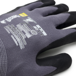 Tricot gris sans couture à base de polyamide, jauge 15, Enduction palmaire en micro-mousse de nitrile avec picots sur la paume, Poignet tricot Certifié OEKO-TEX® STANDARD 100, CQ 1301/1, IFTH ou 15.HCN.70502, HOHENSTEIN
