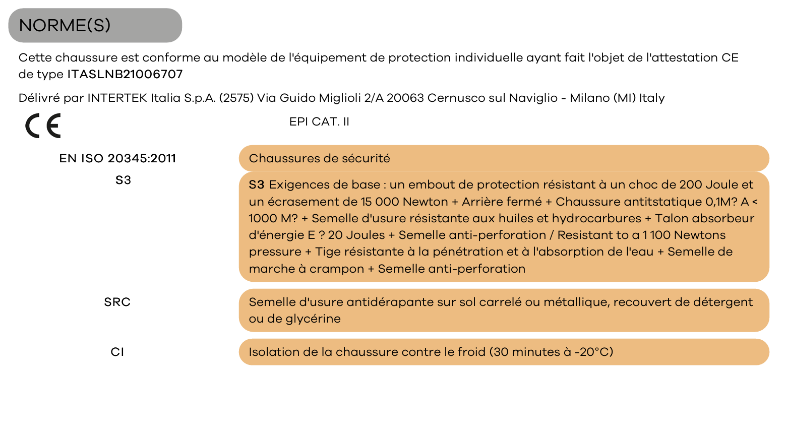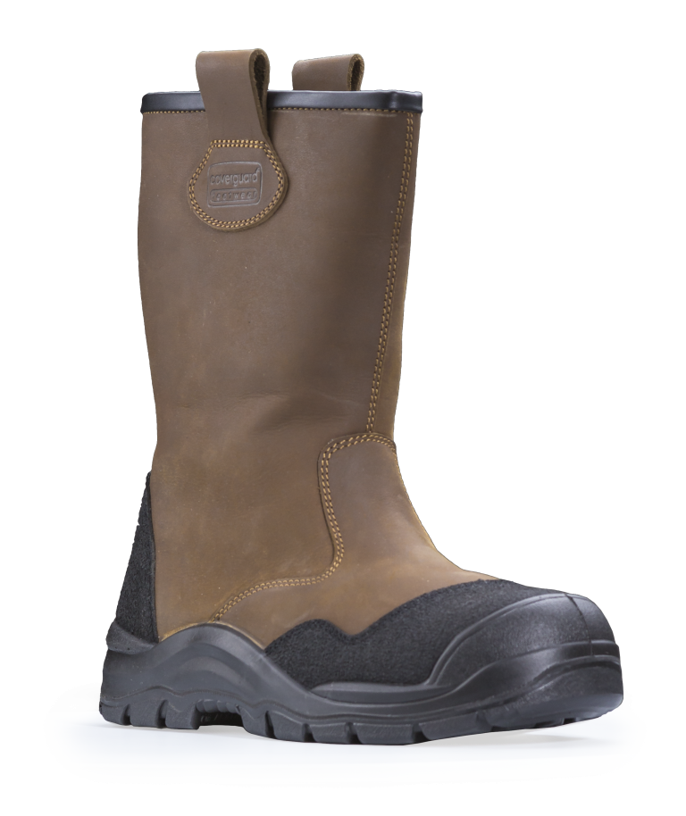Botte de sécurité en cuir pleine fleur hydrofuge finition pull up. Deux tirants latéraux en haut de la tige pour faciliter le chaussage. Semelle en PU double densité ( couche d’usure =1,1 et couche confort =0,65) avec absorbeur de choc et renfort PU à l’avant pour une meilleure protection. Intercalaire anti-perforation non métallique.