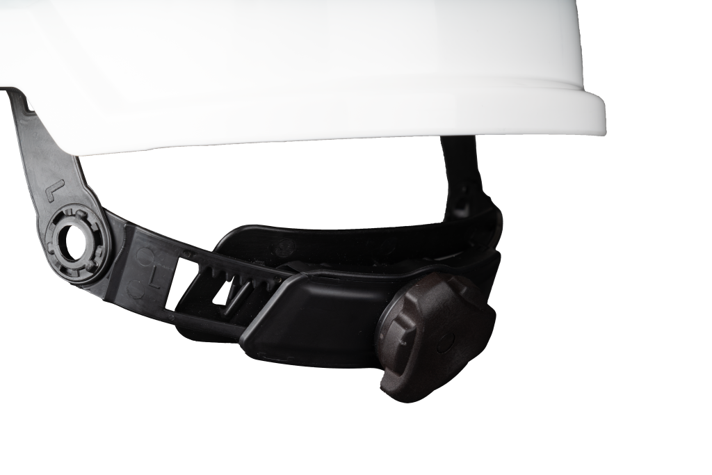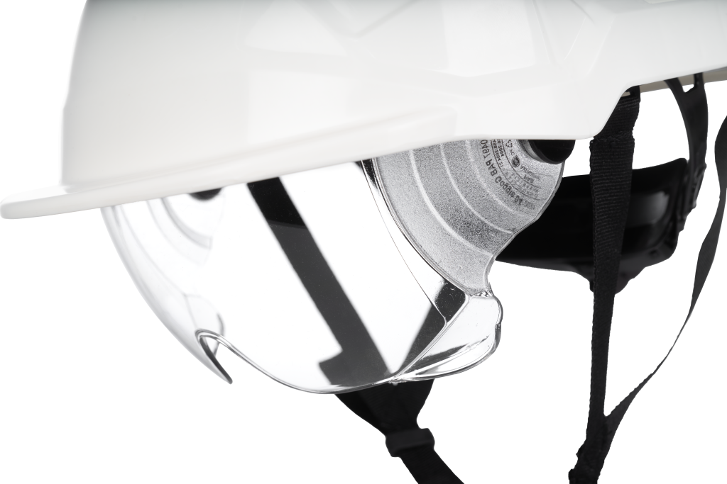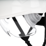 Confort : Lunettes de protection intégrées // Bon équilibre et sensation de légèreté (450g) // Réglage facile par crémaillère // Préservation du champ de vision grâce à la visière courte // Basane en textile 3D textile