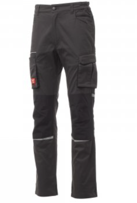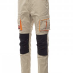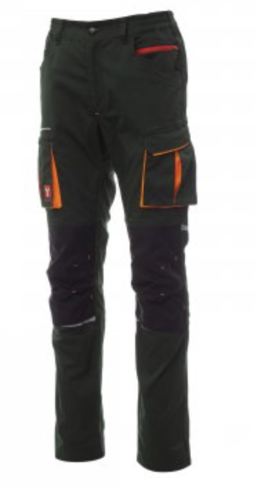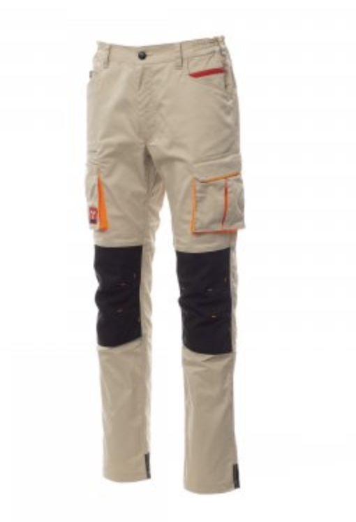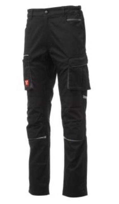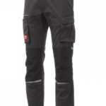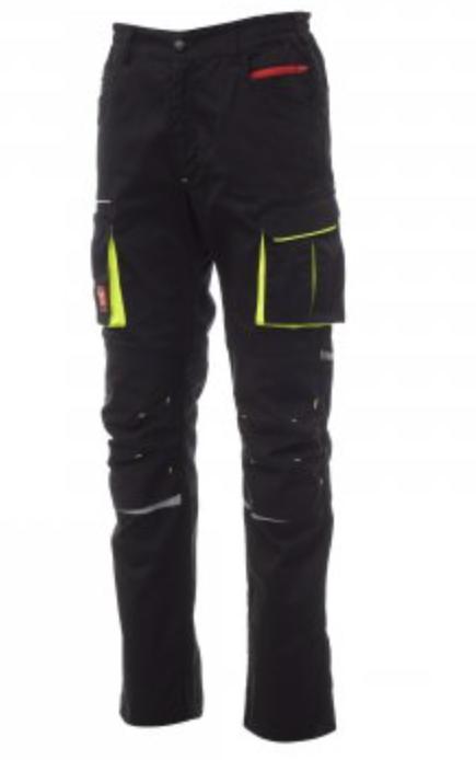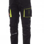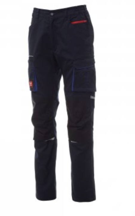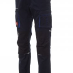 Pantalon unisexe, stretch, multi-saison, avec élastiques latéraux et passants à la taille, fermeture à zip et bouton personnalisé. Doté sur le devant de deux poches profilées, une petite poche porte-monnaie à droite, une petite poche de sécurité fermée par zip à gauche. L'avant de la jambe gauche comporte une poche à soufflet, avec rabat à fermeture autoagrippante et porte-badge. L'avant de la jambe droite comporte : une petite poche pour smartphone avec passepoil rétroréfléchissant et une poche à soufflet. Les deux jambes sont dotées de porte-genouillères, en nylon Oxford 500D, en tissu en contraste, avec ouverture par le bas et d'inserts rétroréfléchissants indiquant l'ouverture. L'arrière comporte : une poche avec rabat et fermeture autoagrippante, une poche porte-mètre (jambe droite) ; une poche ouverte avec deux bandes rétroréfléchissantes (jambe gauche) ; des inserts rétroréfléchissants au niveau des genoux et talonnette en tissu en contraste pour les deux jambes. Coutures à trois aiguilles sur l'entrejambe, l'intérieur et l'extérieur jambe. Baguettes de renfort en contraste à différents endroits.