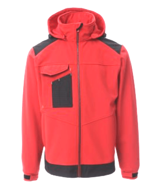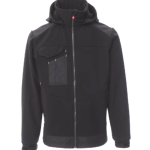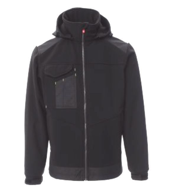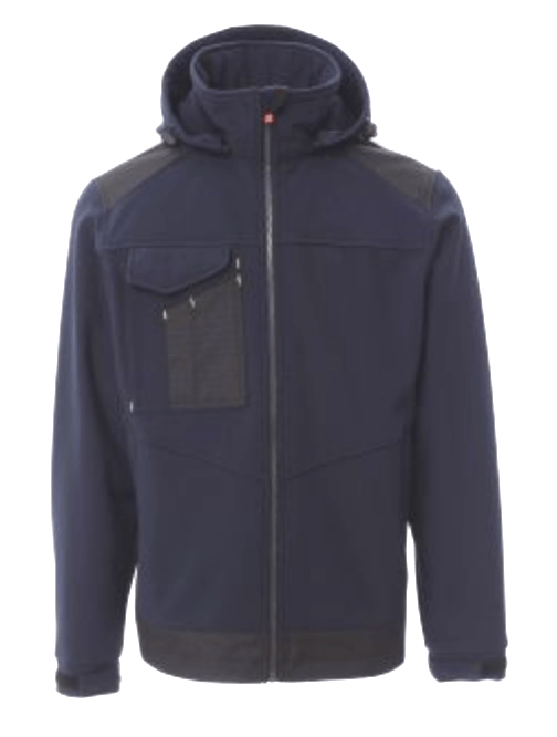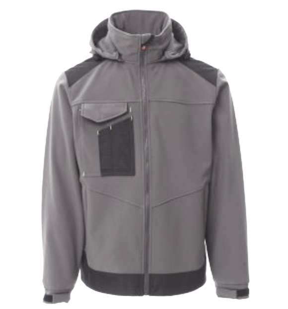 WP 8000 mm H₂O, WVT 5000 g/m² 24h. Soft-shell 3 couches, pour homme, manches montées, fermeture par zip SBS en plastique avec curseur en métal à verrouillage semi-automatique. Capuche amovible et coulisse réglable avec stoppeur. Épaules avec tissu en contraste et bandes rétroréfléchissantes. Deux poches latérales avec zip, une poche poitrine multifonction avec porte-badge escamotable et rabat de fermeture LOCK SYSTEM. Poignets élastiqués, réglables par fermeture autoagrippante. Passepoil rétroréfléchissant sur le bas arrière.